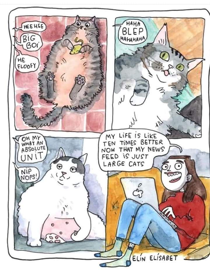 - Ensure your social media has a balance – you may not want to unfollow every political page, but, is there also content which soothes and uplifts? This cartoon may seem extreme, but, do you too need more cat pics in your life?